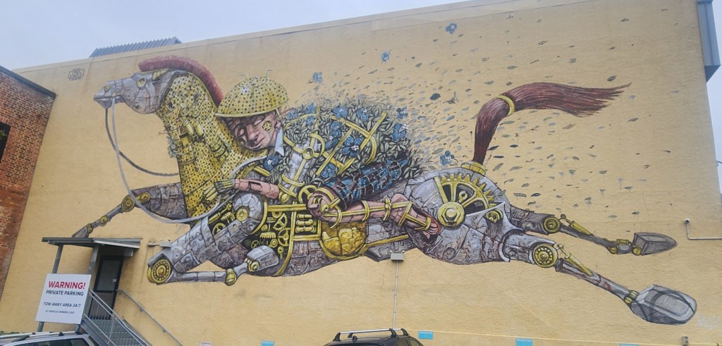 We had a nice walking tour of Dunedin ahead of today’s departure. Additional murals have been added since our last visit 2 years ago, and we actually encountered a muralist in situ.