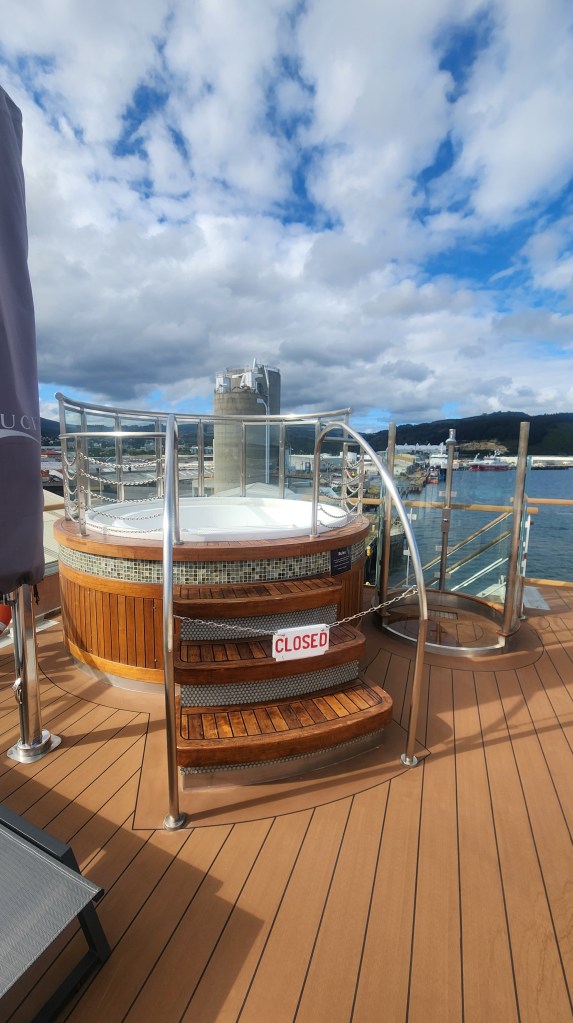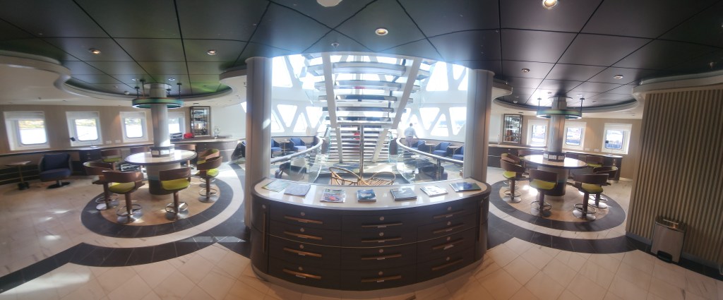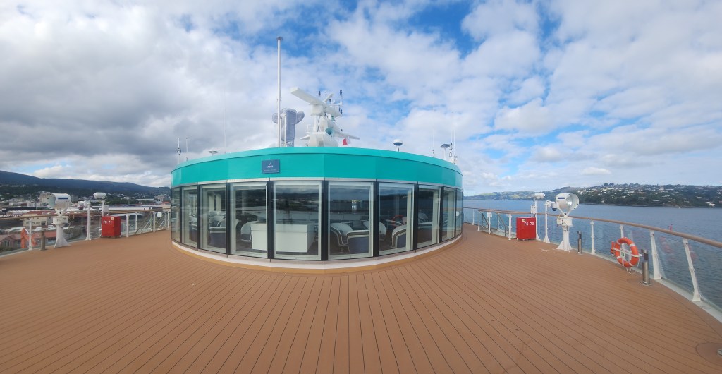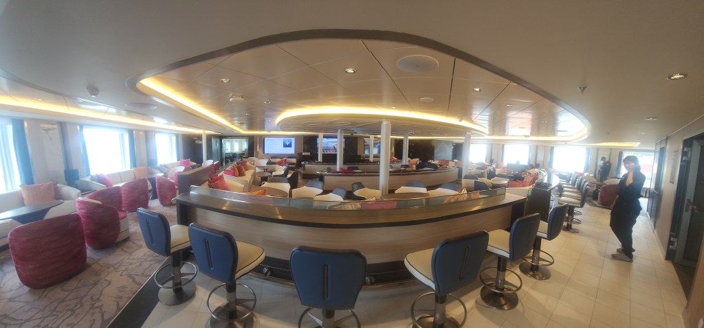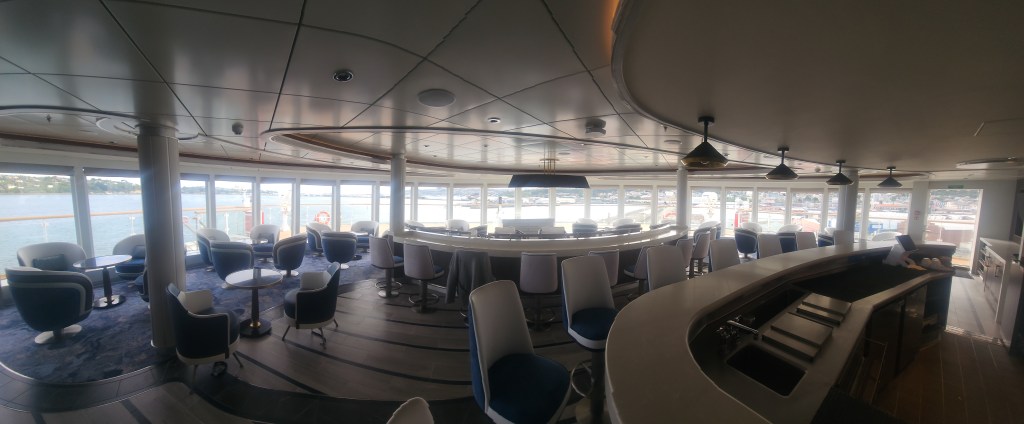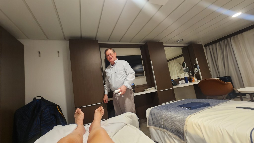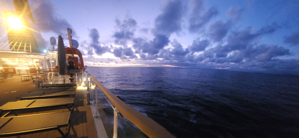 Cousin Lester is adjusting well to his first time out of the sight of land coupled with the deck heaving under his feet. We have a comfortable cabin on the 3rd deck – the cheap seats.