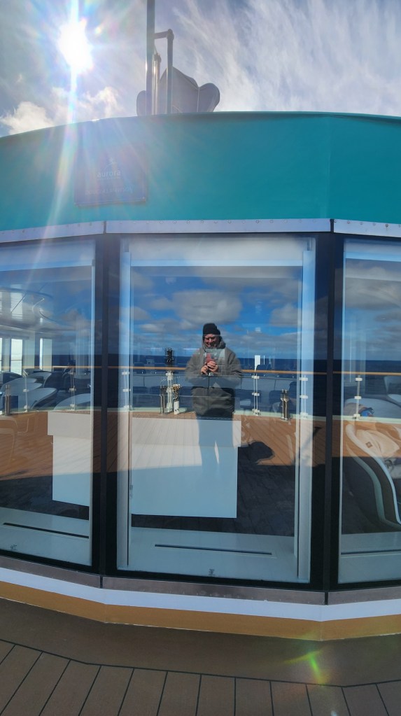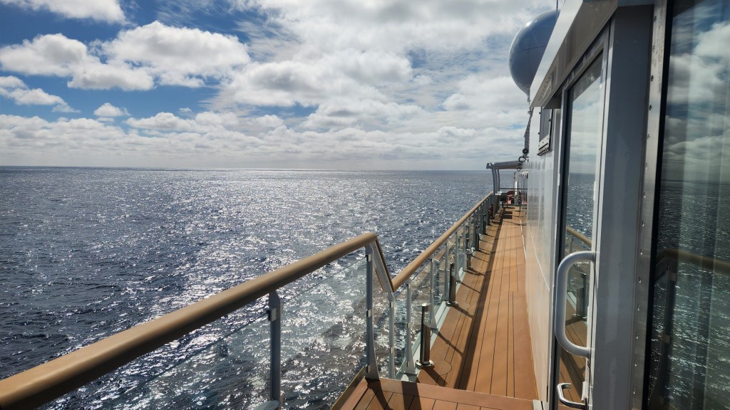 I took a turn around the deck this afternoon in bright sunshine, a stiff breeze and with temps in the 40s somewhere. Bracing.