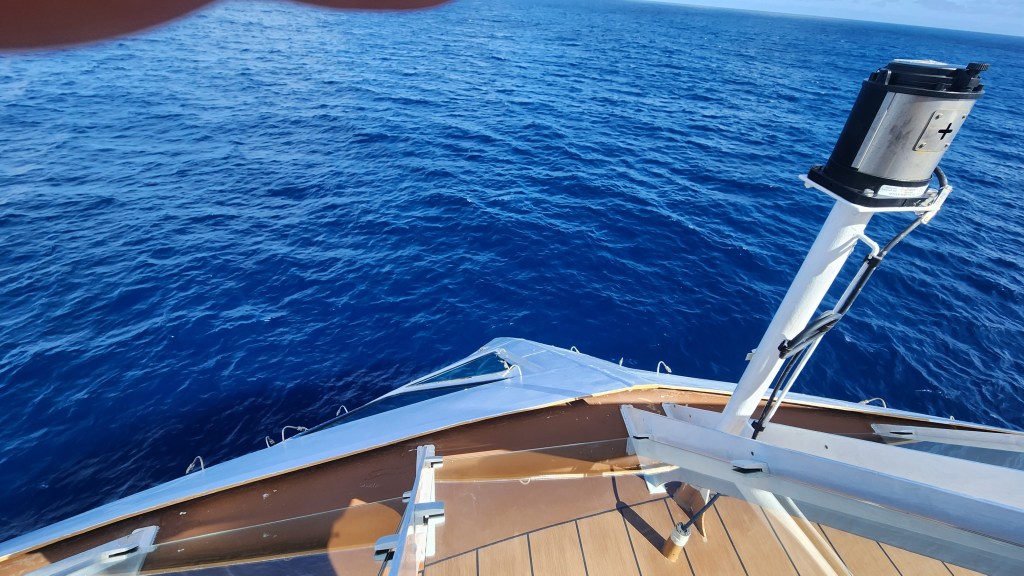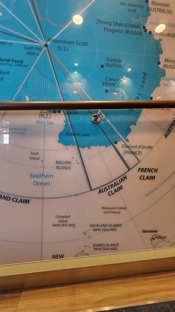 Here the map is bisected by one of the numerous handrails helpfully placed around the ship to steady one as the ship gently pitches and rolls on our southward course.