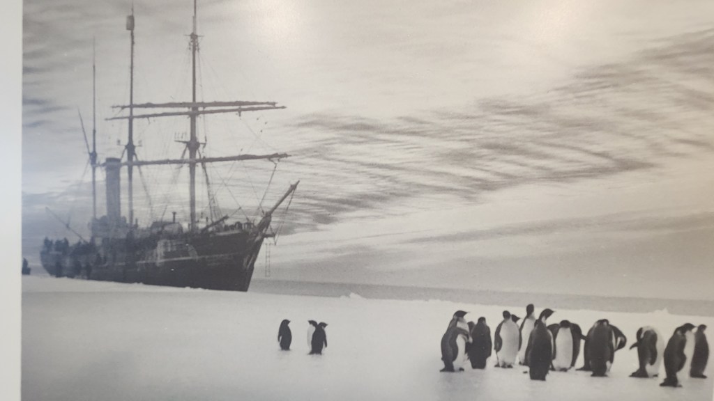 The ship has numerous interesting photos up on the walls. Here’s Douglas Mawson, his ship and a bunch of penguins from 1913.