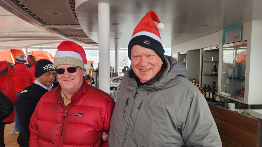 We had fairly calm seas midday and the Mawson organized a barbecue on the back deck. I slipped on my fleece pants, wind pants, fleece shirt, fleece jacket, down inner coat and a down outer coat and woofed down a salad and a hotdog with Lester. Blaring disco music drove us back indoors as soon as we finished.