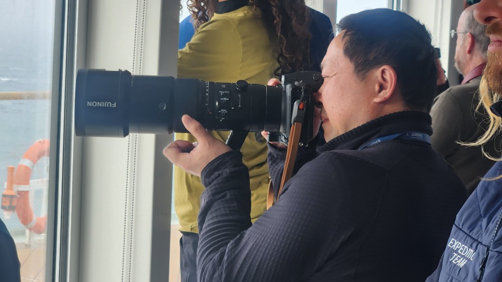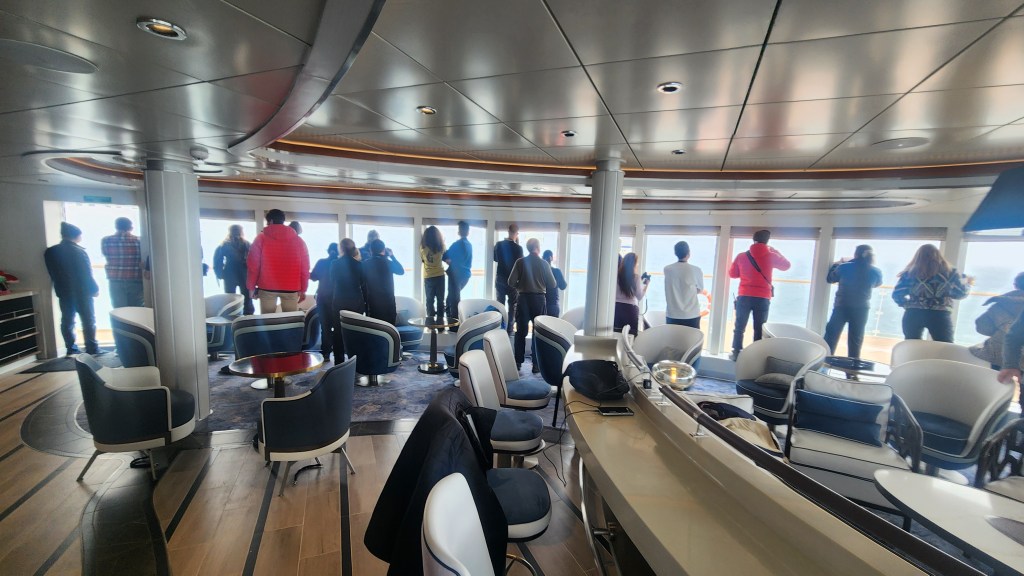 We’ve been taking this in from the Deck 8 Observation Lounge high above the water. An announcement over the PA aboard of a pod of Orcas at one o’clock brought a stampede up here, many with giant bazooka lenses.