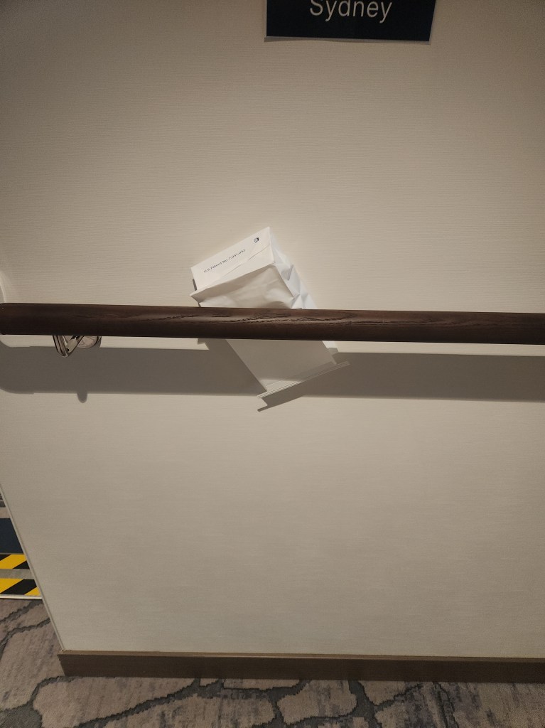 Plan A was to continue along the Ross Ice Shelf for further exploration, but plans changed over night. Winds gusting to 70 have whipped up the seas and we spent the night rolling heavily from side to side. As before, when the rocking and rolling really kicks in, elevator service is discontinued and the staff quietly positions these bags here and there throughout the ship in case one is, shall we say, indisposed coming or going from one’s cabin.