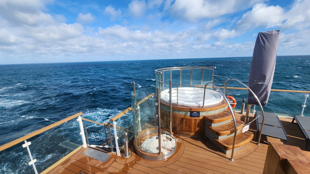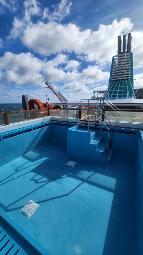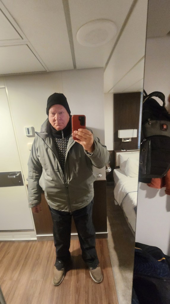 Again I didn’t get far trying to capture photographically the drama of the huge waves boiling along. What had, at bedtime, been a quartering sea astern was by breakfast time this morning, hitting us squarely on the beam, sending passengers and crew lurching from side to side as announcements over the ship’s PA urged us to keep a hand on a railing as we moved about.