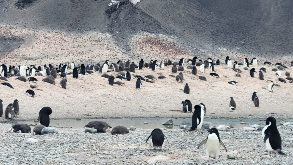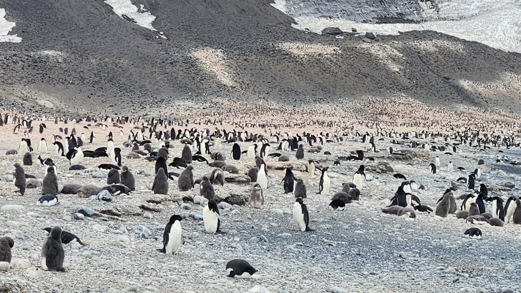 The Bird Lady we have on board delivered an outstanding lecture today on penguins and estimated that the colony of Adelie Penguins we visited, the largest Adelie colony in rhe world, had about 300,000 nesting pairs. Had we arrived a few weeks earlier there would have been another 100,000. Still, with chicks and associated stragglers we were among about 700,000 birds.