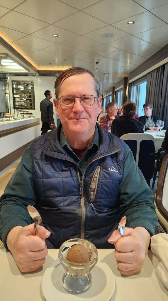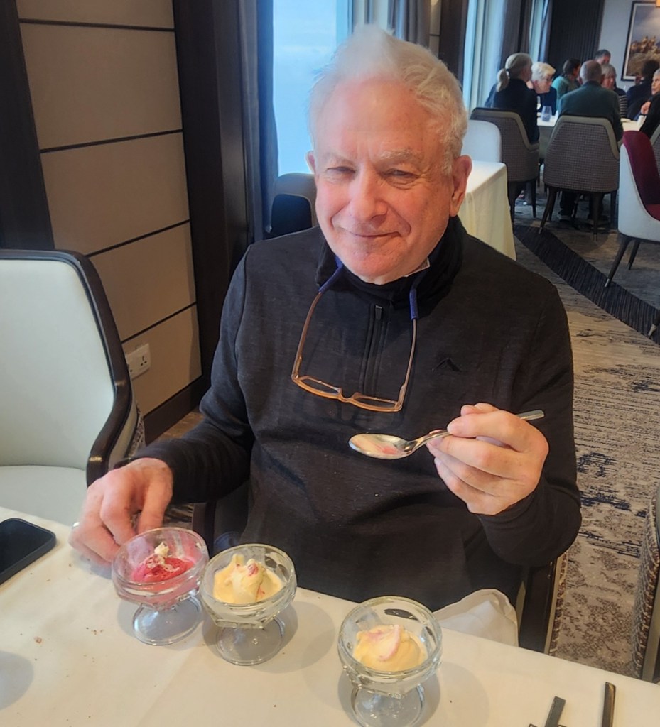 Anyway, returning to the ship we enjoyed another great dinner with L and L finishing up in a blaze of ice cream. “Three Scoops” Sussman took the prize.